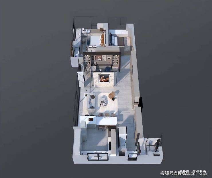 南北贯通的端厅设计,整个户型南北长度接近16米,仅在中间有两个承重柱,端部无柱打造非常连续的景观面,整个客厅等于一个巨型的全景舱。