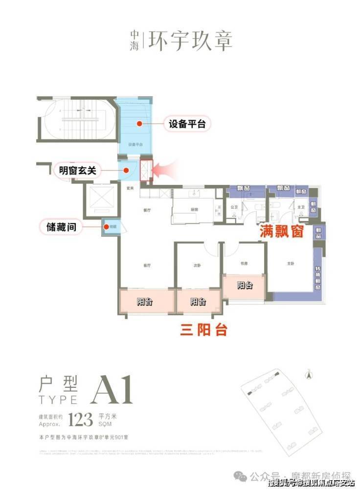 以建面约123㎡3房为例,区别市面上多数仅单或双阳台布局,该户型 四面宽朝南+罕见的南向三阳台,实用性和采光度更强。