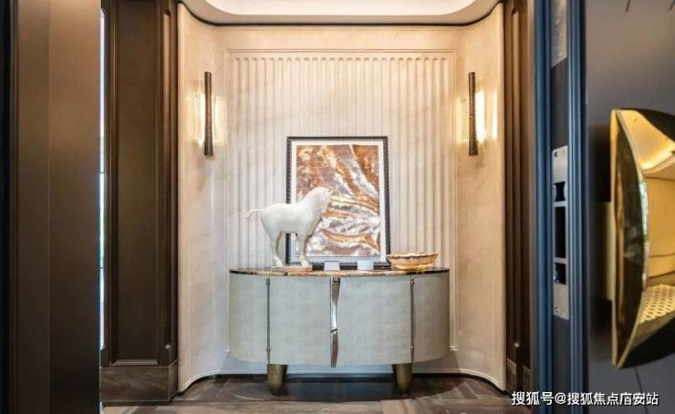 例如入户玄关铺设有“石材皇后”鱼肚印象,这种级别的奢石在很多顶豪项目中通常仅作局部镶嵌