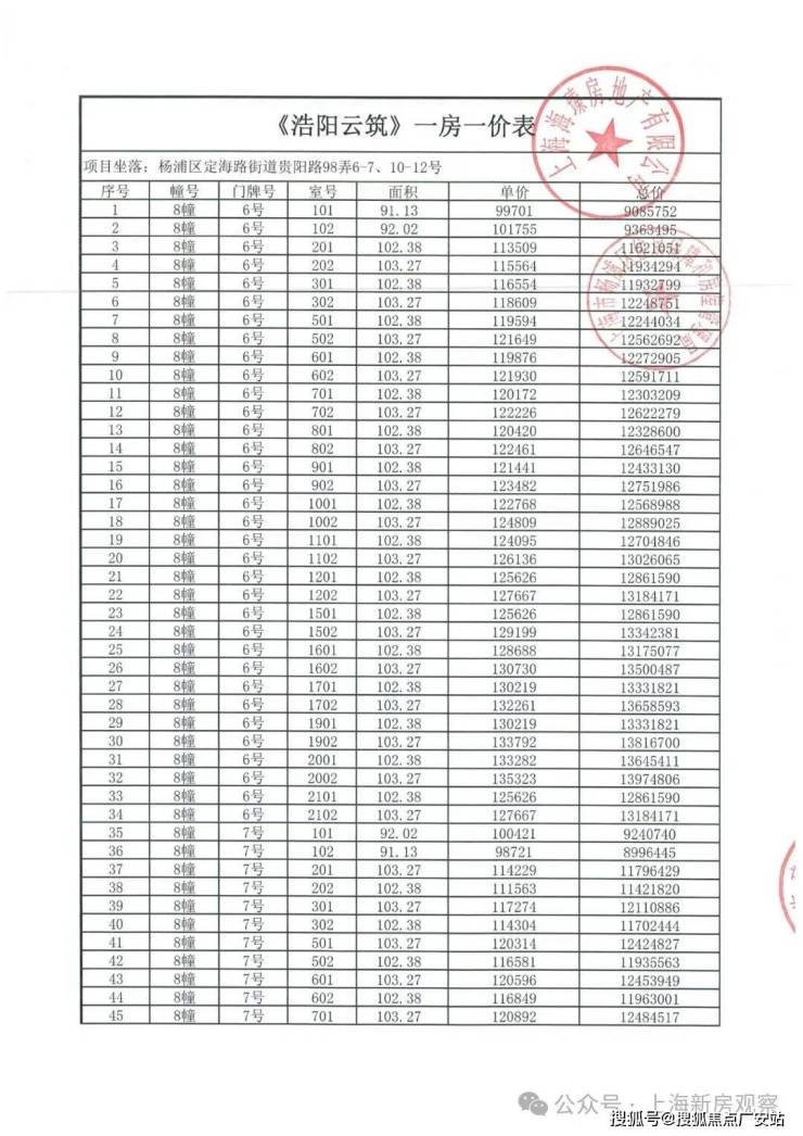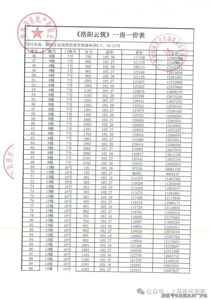 上期一房一价表如下: