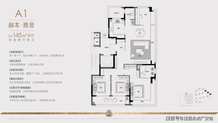 建面约145㎡的户型:项目采用创新的"两梯两户"设计,通过巧妙的空间规划实现类一梯一户的尊享体验。双电梯厅以防火门分隔,确保住户私密性。专属电梯直达户门,10平方米的270度转角入户花园,兼具采光通风优势,将功能性与仪式感完美结合。