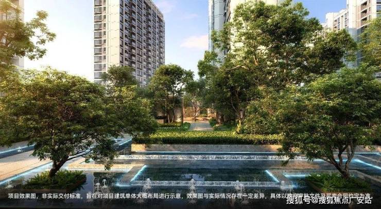 还能在归家的动线上体会到不同的景观节点:境隐门开(主入口空间)、悬廊叠瀑(水岸会客厅)、绿野拾趣(儿童乐园)、轻舞晓影(乐享氧吧)、樾下茶庭(宅前花园)、花香漫语(宅前会客花园)、轻氧花园(全龄活动区)。