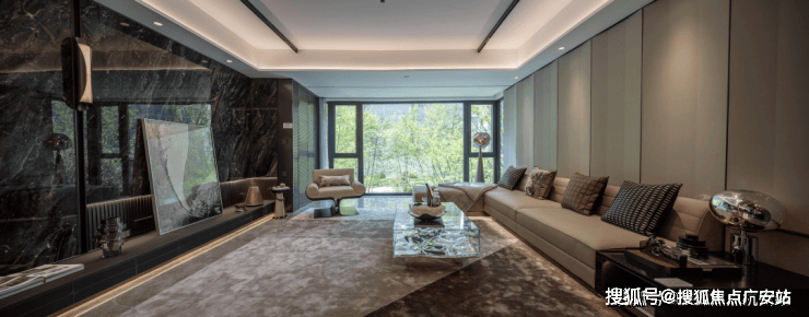 3、高端的爱马仕灰奢石打造的景墙,转角弧面犹如犹如翡翠赌石,优雅贵气。