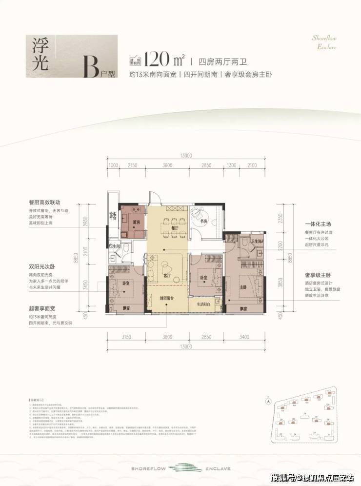 这款户型堪称四开间朝南的“流量王者”,南向面宽约13米,双联阳台+双飘窗设计,视野和采光优秀;套房主卧、双阳光次卧,颇有大平层的气势。