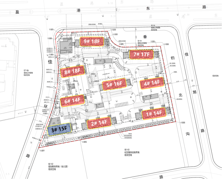 从方案来看,项目多为14-18F的小高层和高层住宅,非人车分流,部分楼栋首层有架空,东面有河道经过,南面规划了一处幼儿园用地(华发代建)。