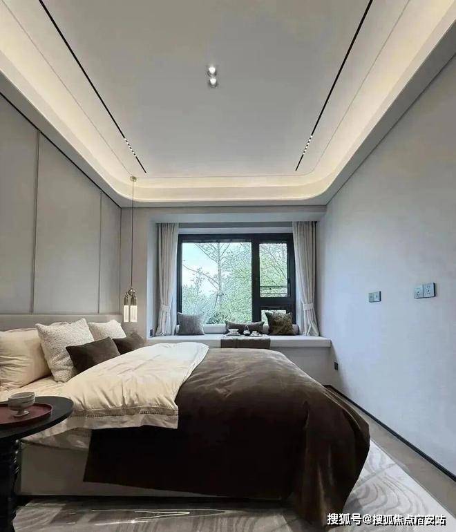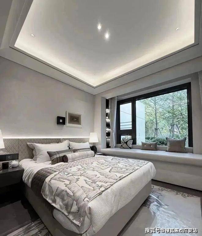 主卧转角落地窗+飘窗,也算是非常少见的了。净面宽约3.6m,不算进门的衣柜,进深大约5.7m左右。根据测算,✅✅中环置地中心望云售楼处电话:400-9692-958可以放置宽约2m的床+2个床头柜(宽度约45cm/个)是可以的。