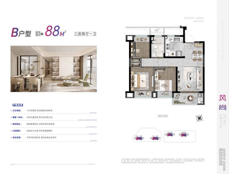深嘉上府约88㎡户型,将三房两厅一卫的布局打磨得非常成熟。