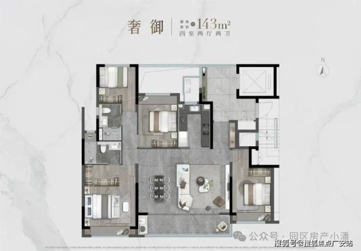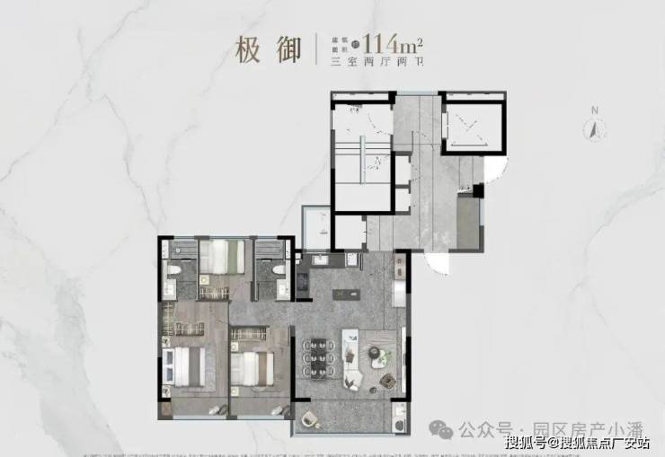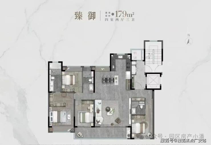 主力户型为建面约110-180㎡三至四房,采用"全明通透、动静分离"布局,得房率高达85%。180㎡四房配备独立玄关、双主卧套房设计,主卧270°转角落地窗直面湖景,U型厨房与中西双厨设计满足高端生活需求。