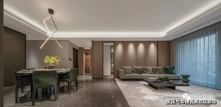 室内设计,秉承摩登东方的理念,设计以人、生活为中心,从空间本体和情感层面都回归生活,270度环幕采光,开放式会客厅设计,兼具尺度感与功能性。