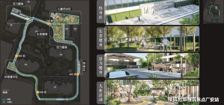 精心设计的环绕社区的400m跑道系统串联热身区、定制主题儿童活动区、老年健身区、活力健身区和休憩缓冲区五大运动活力系统,家人在社区内锻炼身体的祥和画面呼之欲出。