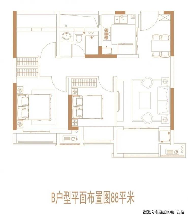 约88㎡户型方正,不到90㎡做到3个房间还是很惊喜的。不过这个户型就一个卫生间,比较局促,而且还是单阳台,适合一些预算不多的客户。
