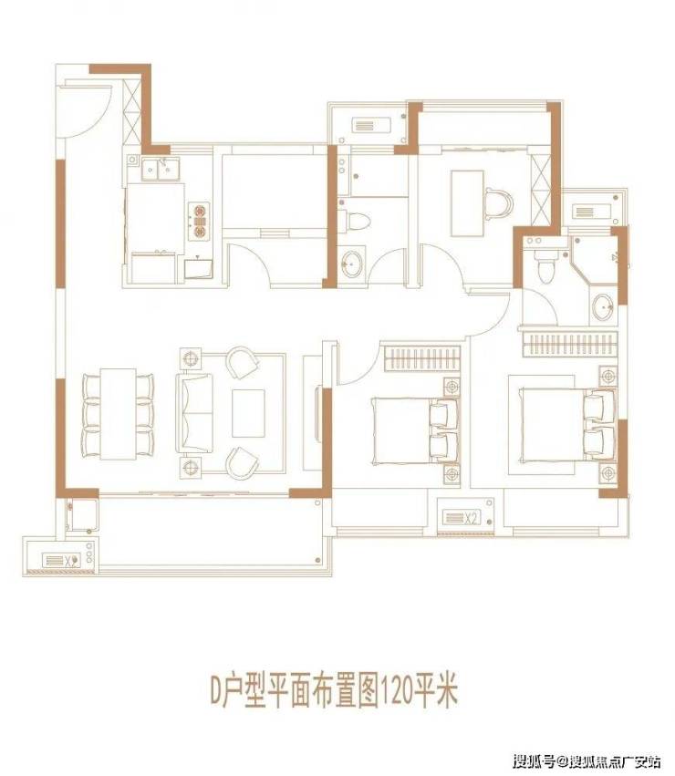 四房适合刚改和改善型家庭,大横厅的设计,采光可以保障。南向两个卧室均设计飘窗,120㎡做到横厅+四个房间,整个面积利用率很高。