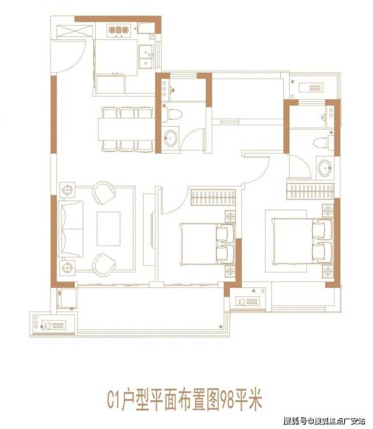 建面约98㎡3房2厅2卫: