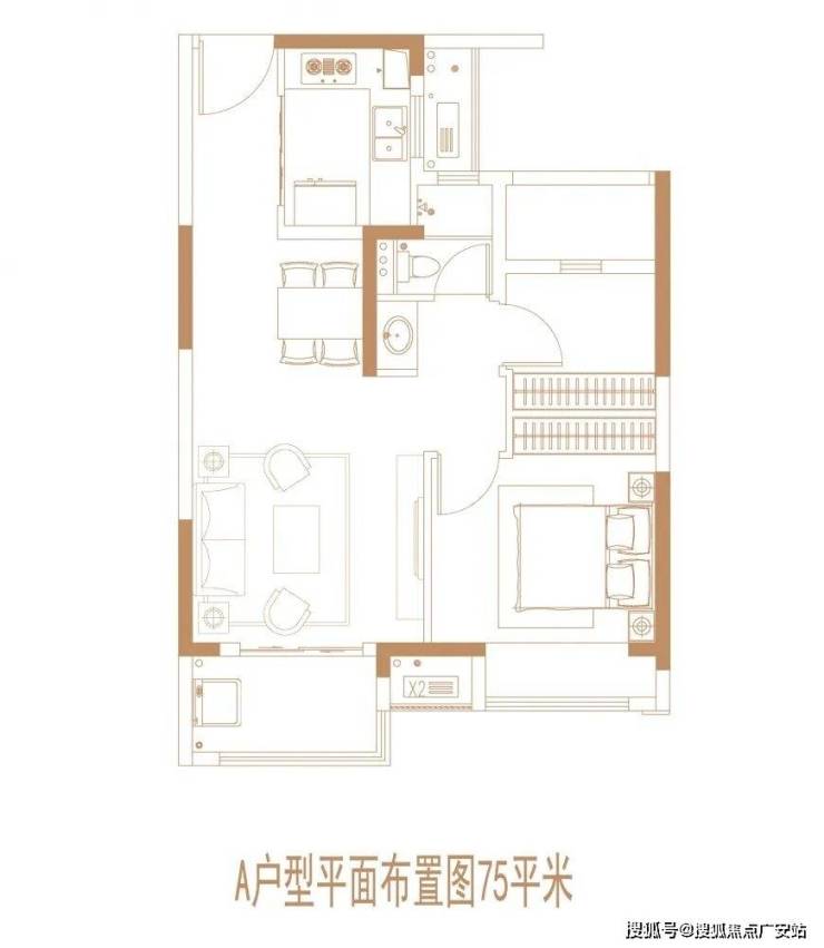 建面约75㎡2房2厅1卫: