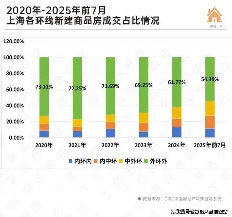 值得注意的是,上海外环外一直是新房供应和成交的主力,其中一手房供应和成交占比近五年都在一半以上,今年前7月外环外新房成交188.31万平方米,占比为54.39%。从趋势来看,2021年以来外环外成交占比逐年下降。