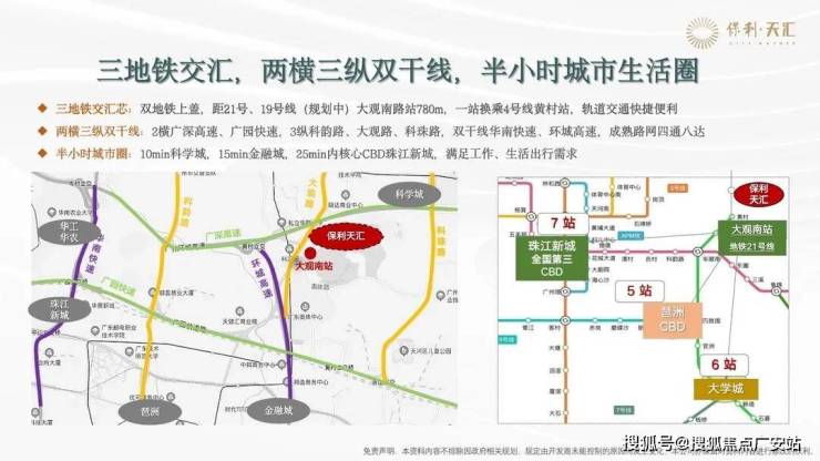 项目距离21号线大观南路站约1.2公里,步行大概需要15分钟,建议买个小电车接驳,一站换乘4号线去往金融城、琶洲,4站到员村换乘5号线直抵珠江新城。