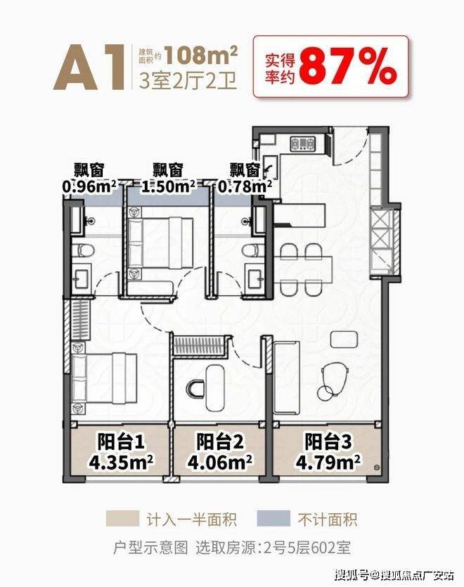 建面约108㎡3房,三阳台面积达约13㎡(赠送一半),飘窗赠送约3.3㎡,室内使用面积达约94.5㎡,实得率高达约87%,总赠送面积比常规次卧都大。