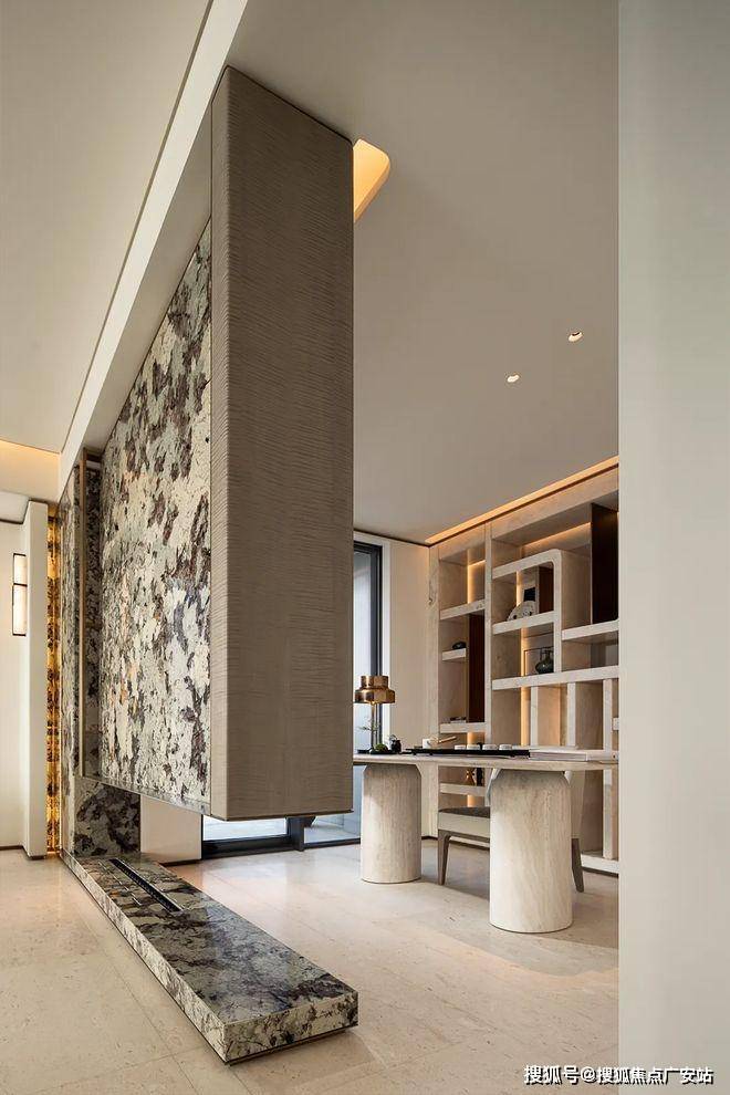 同时,序厅内部墙面同样选用奢石铺贴,地面则以精致拼花奢石铺就,让归家的每一步都充满尊贵感与仪式感。