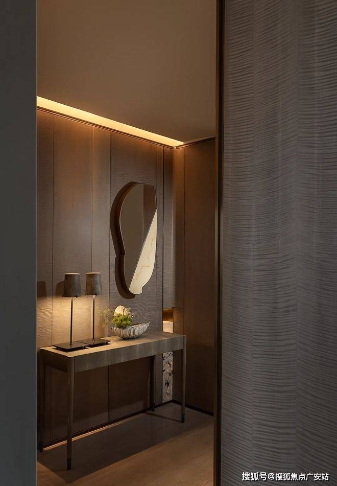 胡桃木饰面与金属收边形成材质对话。