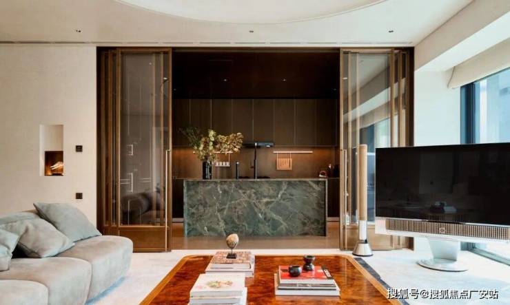 极致尺度:约 3.3 米层高、三梯三户、270° 全景落地窗、LDK 一体化横厅,劲性柱结构得房率约 77%,无承重墙灵活布局