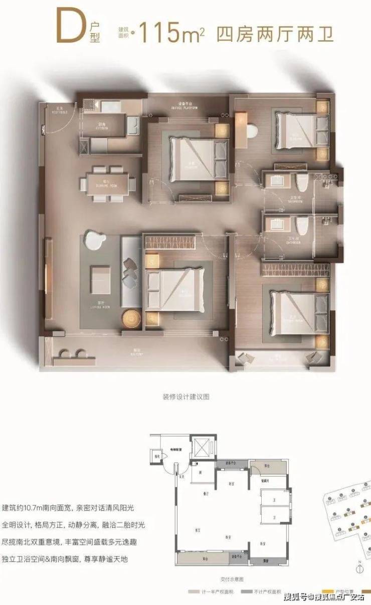 All the units with a construction area of approximately 110 square meters are side suites, offering a rich view. The four-bedroom, two-living room and two-bathroom design combines a sense of scale and respect.