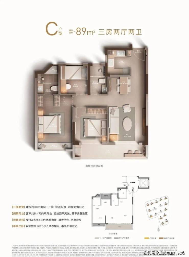主力产品为建筑面积约89㎡户型,三房两厅两卫格局,南向三开间带宽幕双阳台,轻松容纳三口之家的温情与欢乐;