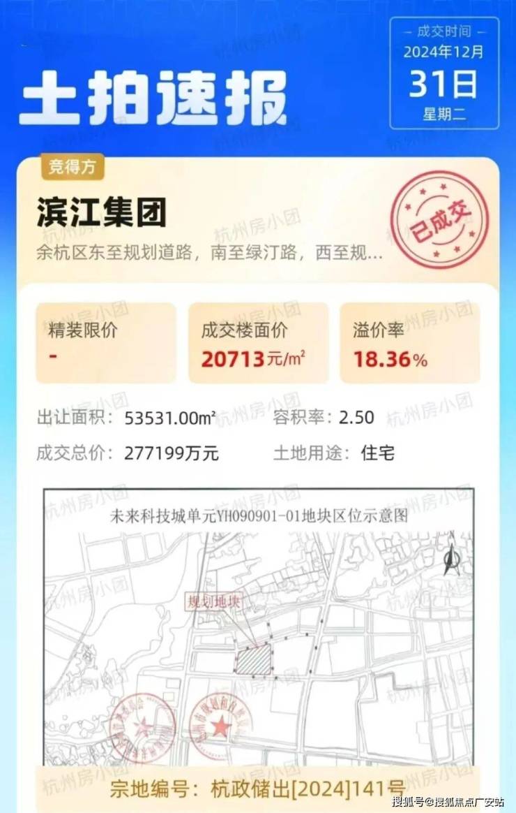 滨江绿汀北地块,杭政储出[2024]141号未来科技城单元YH090901-01地块,经过44轮竞价,由滨江以总价277199万元竞得,成交楼面价约20713.08元/㎡,溢价率18.36%。