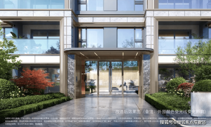 同时,在入户大厅的外墙上也采用香槟金铝型材与灰色石材,门头雨棚采用香槟金色弧形铝板装饰,搭配大玻璃面,这个颜值和尊贵感,在这个价位段十分难得。