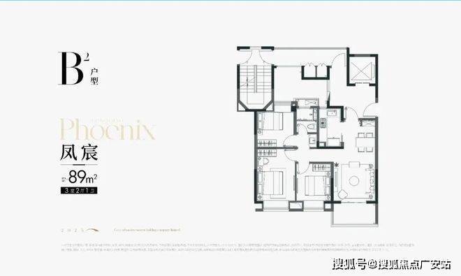 · 建面约89㎡户型则做到了3房的功能性,且三开间朝南+动静分区,设计水准颇高!