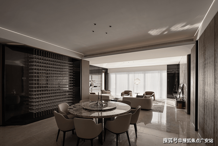 空间在材质搭配上,也是极尽雅奢可能。鱼肚白岩板打造的大岛台,营造温情的社交一隅;木饰面与金属软硬质感的碰撞,有序的墙面分割把握了整体空间的节奏感;双背景墙分别由鱼肚金岩板和劳伦黑金色系展墙组成彰显奢华。