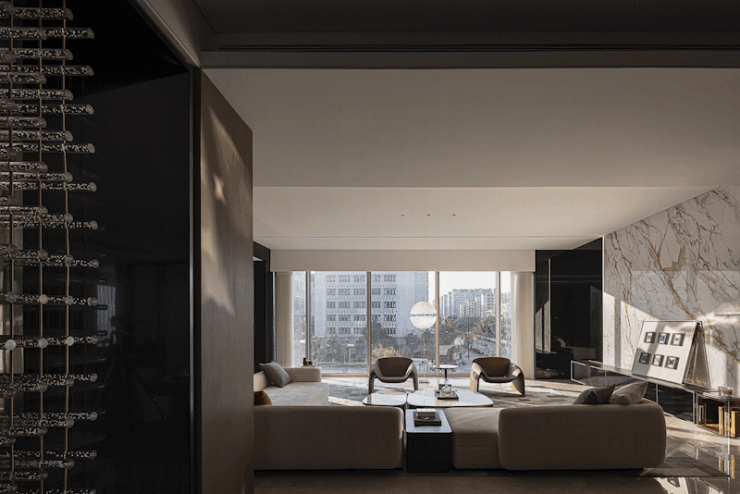 作为杭州最早的大型居住区之一,在首层入户大厅公区,以钛金板+背景墙石材+木格栅的组合,延续着宝格丽一贯富有格调的装修风格。唐忠汉先生非常倡导场域中心论,他通过LDK一体化设计新趋势,让整个开放空间形成了室内的场域中心,尽享景观视野的同时,也就是社交空间。