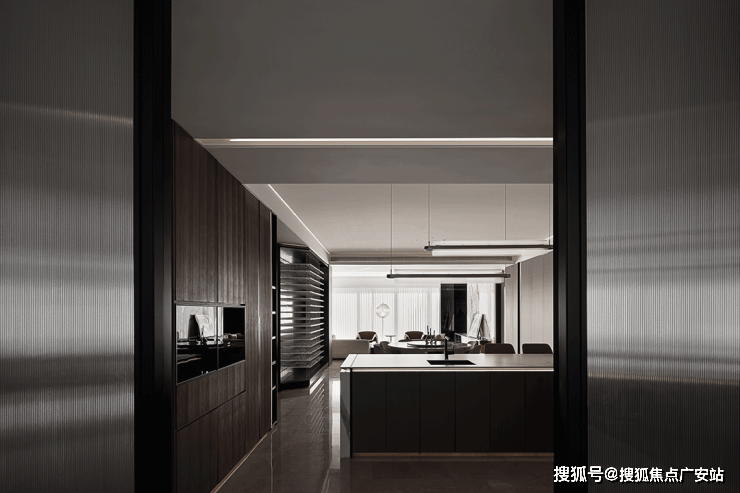 木饰墙面从客厅延展到餐厅和中岛区,利用材质软性分割不同区块。木质包含的反差感,调节空间的感官情绪,也建立起相对的静谧和独立。中岛台成为厨房与外部公共区域的纽带,消除了区域阻隔,提供更为优越的居住体验。