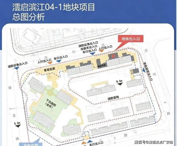 项目共设三个人行出入口、两个车行出入口及两个消防应急入口。主要出入口位于地块北侧的德州路,南侧耀川路同时设置一处人行及一处车行出入口。东侧济明路设有非机动车出入口。此外,值得注意的是,地块东北侧沿街面设置了规划中的地铁19号线德州路站出入口,业主可通过景观连廊便捷出行。
