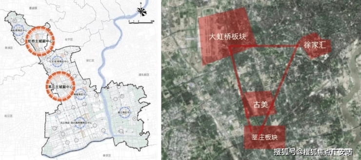 横跨中环线,部分地块位于中环内,紧邻西郊、古北、漕河泾、徐家汇、虹桥。