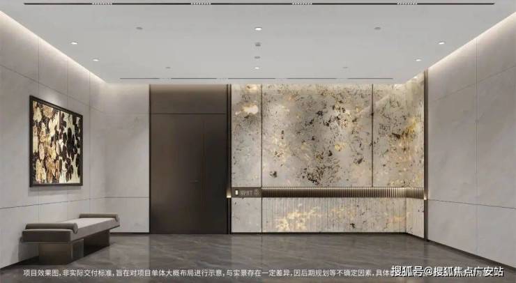 高定地下入户大堂,延续首层入户大堂材质高标,精选雪山银狐天然透光奢石,营造精奢生活质感。