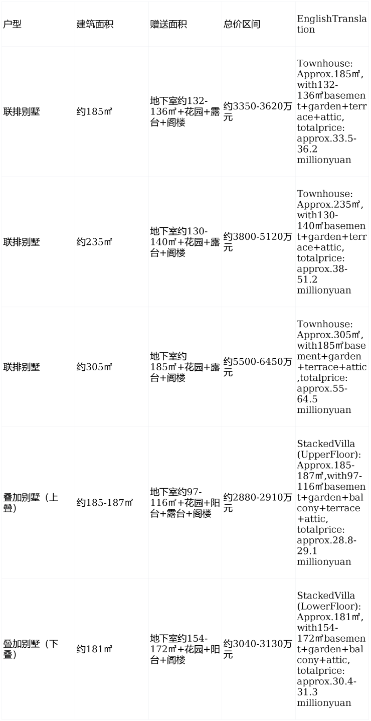 建面约185平方米,赠送地下室:约132-136平方米;赠送花园、露台、阁楼,总价约3550-3620万