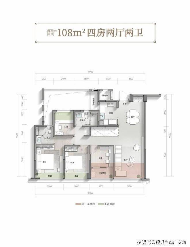 南向主卧带走入衣帽间,南向次卧带270°采光与观景视野阳台,甚至北向两个房间开间均达约3米,通常这些是很多在售140㎡以上户型才有的房间尺度感。这款128㎡户型。