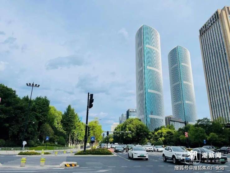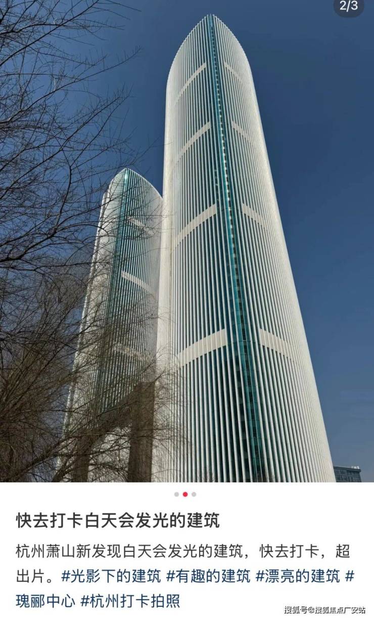 之所以白天会“发光”,浙江省建筑设计研究院参与建筑设计的相关负责人向记者解释:“双子塔主楼采用了曲面三角形的平面形式,外立面通气扇与铝合金装饰线条高度集成,随着曲面的弧度转动角度,有了极具韵律的变化。从不同的角度看,建筑的弧度与光影交织,装饰线条缝隙宽窄变化形成的视错觉,给人带来一种建筑会‘发光’的视觉体验。”