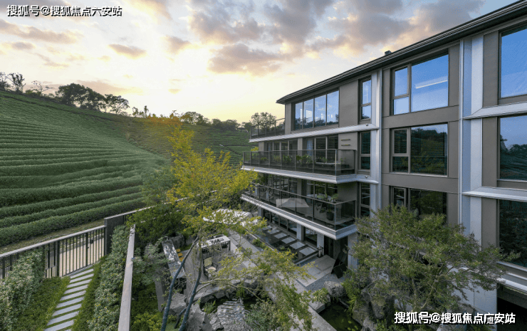 项目建筑风格采用黑屋顶的中式叠墅,以“修复山脉”为理念,由GOA大象设计操刀。外立面融合香槟金铝板、玻璃幕墙及橡木灰金属,窗墙比达60%,如远山淡影隐入茶陇。
