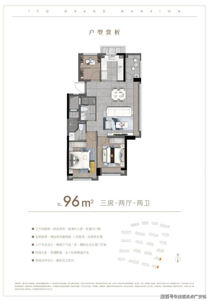 户型方面:约85-96㎡的全三房设计,每一款户型都是会传递出国贸的产品观。南北通透,布局考究,动静分离。