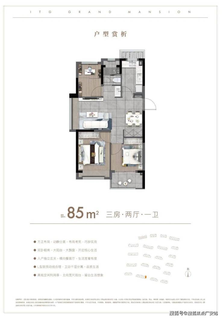 户型解析:约85㎡的3房,这种入门级的产品也要保证居住的尺度感。比如利用L形厨房与餐厅相连接,一体化的设计让空间充足利用。比如次卧连接阳台,就是人性化考虑到给他们一个私密的追光天地。