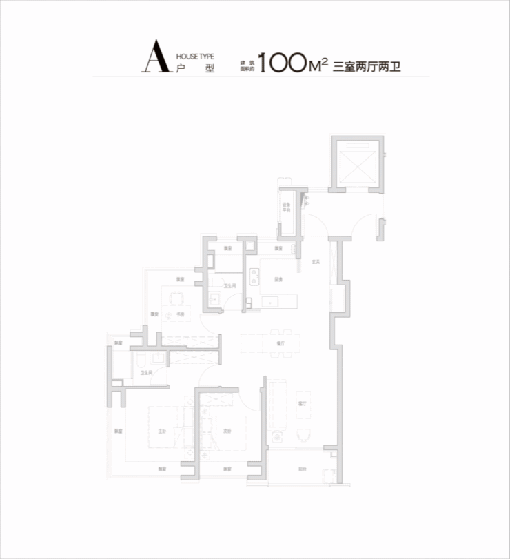 100㎡户型,双270°飘窗设计(南向主卧+北向书房),南次卧、厨房、双卫飘窗,厨房烟道外移,飘窗配置抽屉,极致空间利用率。