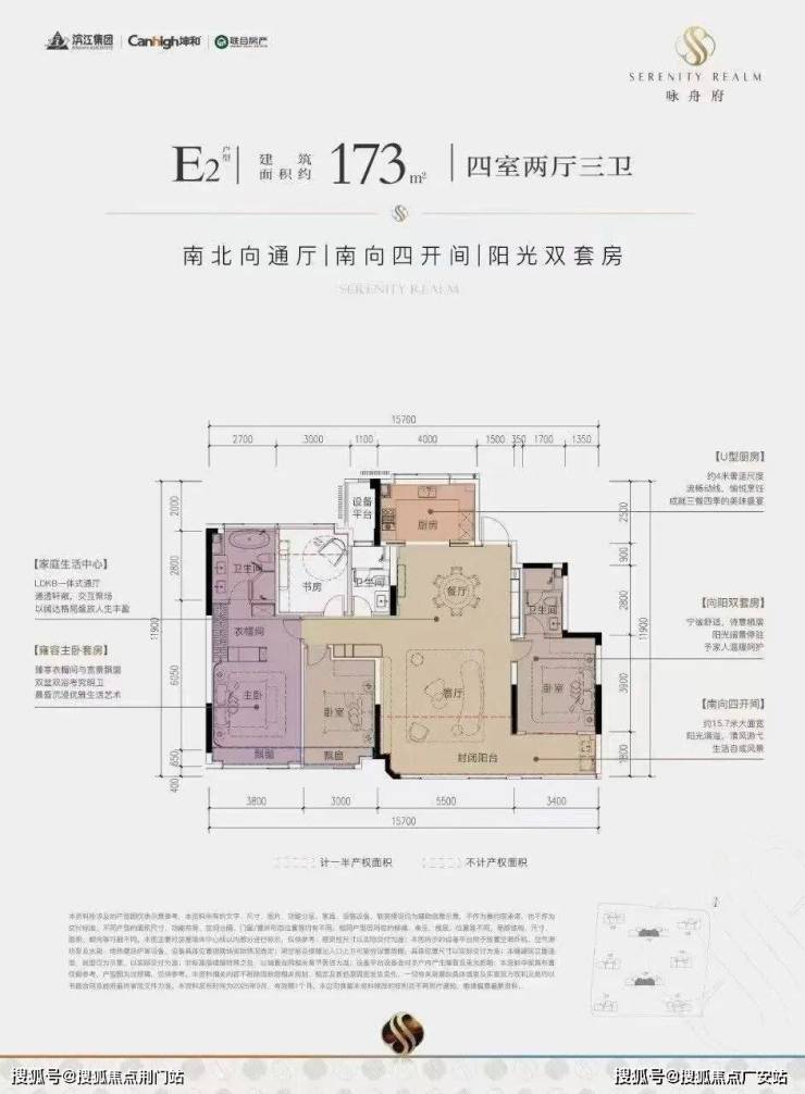 四开间朝南,南向面宽超16米。双套房设计,满足二胎家庭、三代同堂等不同居住需求。餐客厅空间阔绰,可放置圆桌,符合中国人团圆的爱家情怀。