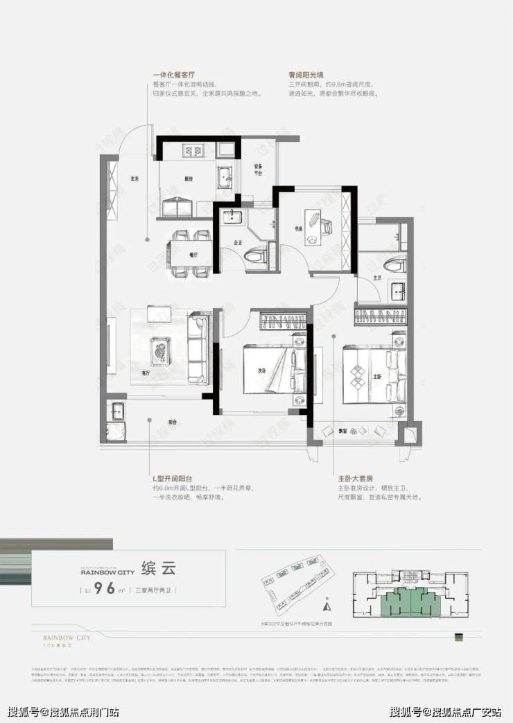 像建面约96㎡户型,整体三开间朝南设计,约9.8m奢阔尺度,户型方正大气,明亮通透,动静分区,再加上约6.6米开阔L型阳台,轻松实现一半洗衣晾晒、一般诗意生活的美妙画境。