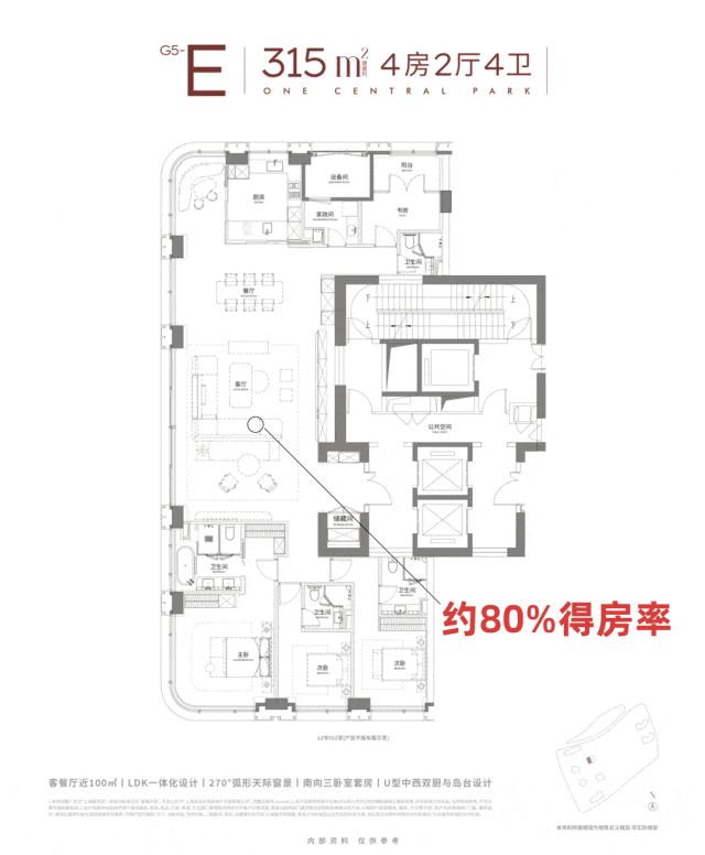 超80%的得房率,LDK一体化厅+西厨岛台,L型大面积转角落地窗,呈现出270度的幕布视野,这个王者公区的尺度不到现场来看,根本是你想象不到的震撼!