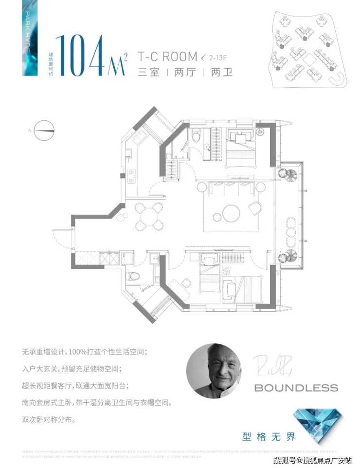 除了1房、2房,项目也有大户型。比如,建筑面积约104㎡3房,客厅面宽达到约3.6米,主卧套房配有独立卫浴,呵护二人甜蜜世界;三房设置随心所欲,兑现三代同堂的幸福梦想。