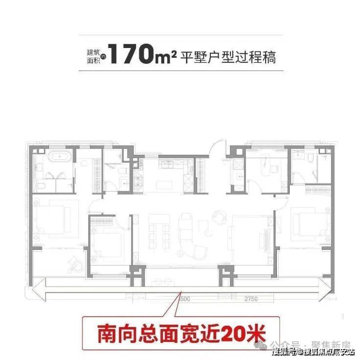 建面约170㎡户型: 直接放大招,五面宽,南向总面宽17.2米,客厅面宽8.2米,主卧面宽5.4米,自带衣帽间、独立收纳空间。三个套房设计,把豪宅该有的尊崇感安排得明明白白。