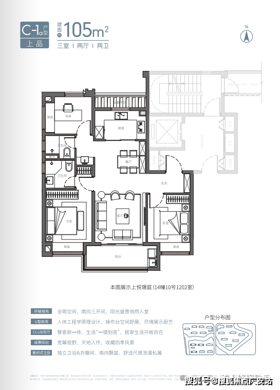 U型厨房、餐厅、客厅、阳台一线联通,南北通透。主卧套房、全卧飘窗、次卫干湿分离也都是标配。