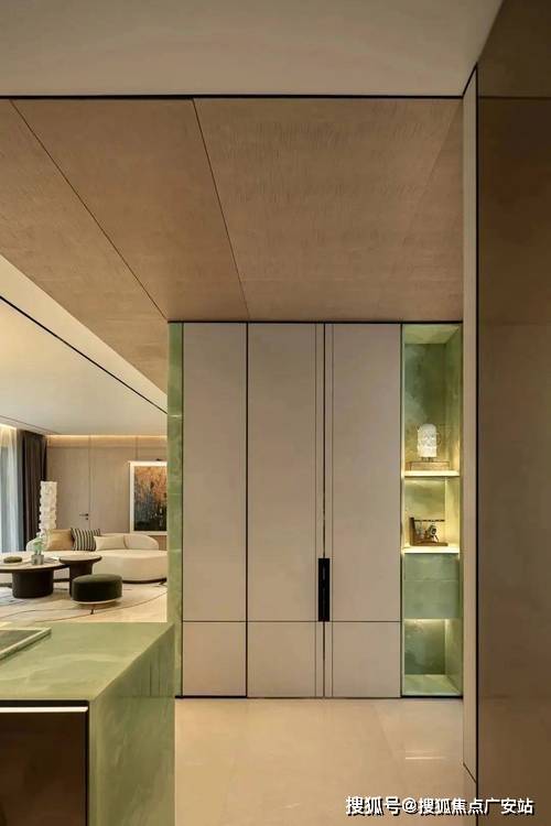 门庭。这里特指单元门庭,通高约4m,气势恢宏。大面积的金属屋檐外挑,彰显贵胄的同时,又扩大遮风挡雨的面积。进门左侧,色彩饱满的普拉达绿竖版镶嵌,美学传达与奢华品质相辅相成。进门后,又是大幅岩板上墙,气质拉满。