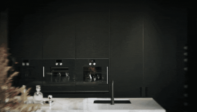 ◉西厨|穿过深色,步入素净的烹饪区,嘉格纳燃气灶、电磁灶嵌入大理石台面,与400系列冰箱,以克制姿态让烟火熏陶出艺术质感。